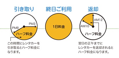 以下の金額は1日あたりのご利用金額です。15​:00〜18:00までの引き渡し、または9:00〜12:00までのご返却の場合はショート料金が適用され、1日料金の半額となります。
